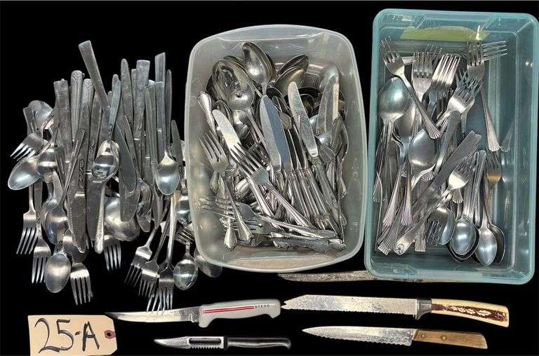 LOT 25A - LARGE LOT OF ASSORTED STAINLESS SILVERWARE, DIFFERENT PATTERNS, AND USED KITCHEN KNIVES