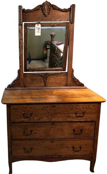 LOT 84 - ANTIQUE OAK 3-DRAWER DRESSER WITH TILTING MIRROR
