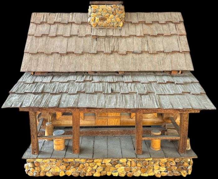 LOT 185 - NEAT WELL-MADE HEAVY LOG CABIN DECORATIVE STRUCTURE - APPROXIMATELY 20 INCHES WIDE X 16 INCHES TALL