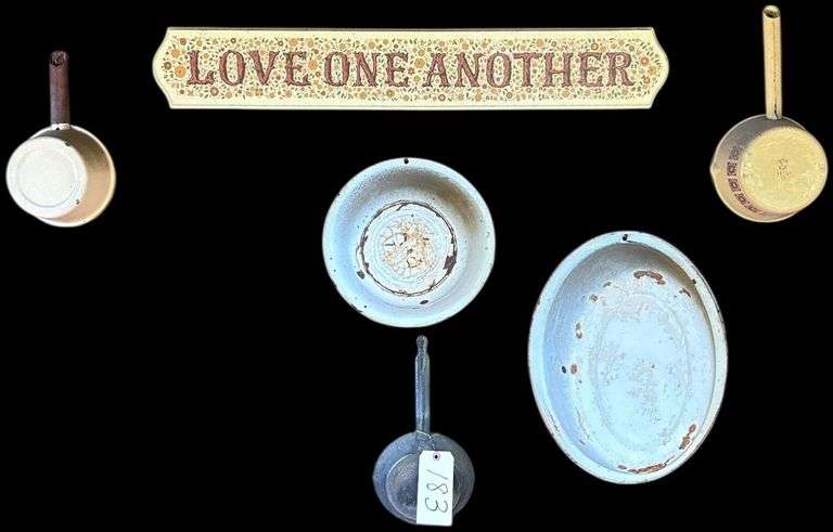 LOT 183 - 5 PIECES OF VINTAGE ENAMELWARE W/ "LOVE ONE ANOTHER" WALL HANGING