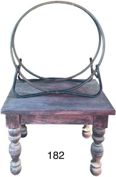LOT 182 - METALLIC FIREWOOD RACK W/ SMALL HEAVY WOODEN TABLE
