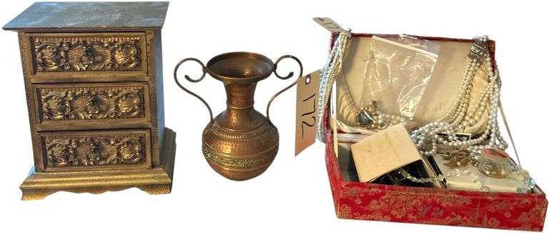 LOT 172 - FABRIC COVERED JEWELRY BOX WITH ASSORTED NICE STRANDS OF (UNTESTED) PEARLS/PEARL TYPE STONES AND OTHER PIECES, 3 DRAWER GOLD-TONE JEWELRY BOX, BRASS/COPPER HANDLED VASE