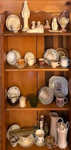 LOT 157 - CONTENTS OF CABINET: LEFTON FIGURINE AND OTHER LEFTON PIECES, SMALL HULL VASE, FIREKING CUP, OTHER CUPS/SAUCERS, OLIVE GREEN GLASS HANDLED PIECE, AND OTHER ITEMS (CABINET NOT INCLUDED)