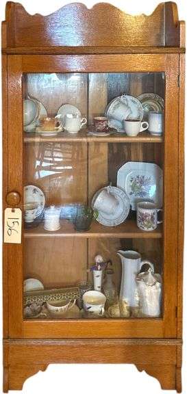 LOT 156 - ANTIQUE OAK 3 SHELF SMALL GLASS FRONT CABINET - NICE CONDITION