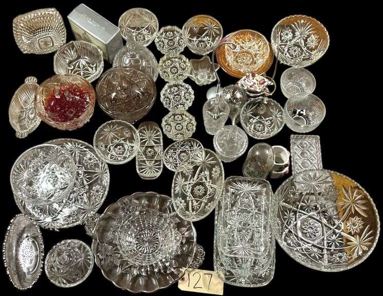 LOT 127 - ASSORTED CLEAR PATTERN GLASSWARE TO INCLUDE CREAMER, SUGAR, BOWLS, RELISH DISH W/ SILVER INLAY, OTHER PIECES WITH SILVER INLAY, OTHER DIVIDED RELISH DISH, LARGE SERVING BOWL, ETC.; 4 PORCELAIN TEAPOT SHAPED SPOON RESTS; 2 NAPKIN RINGS