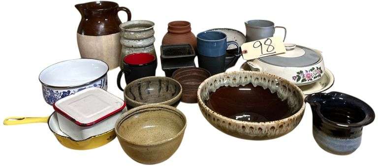 LOT 98 - IRONSTONE DRIP PATTERN MIXING BOWL, ALEWINE POTTERY CREAM PITCHER, 3 POTTERY BOWLS MARKED “ONION”, MCCOY POTTERY VASE, BLUE WILLOW ENAMEL WARE BOWL, MADE IN HOLLAND SAUCE BOWL, ENAMEL WARE SQUARE BOWL W/ LID, LARGE POTTERY PITCHER MARKED USA, AND MORE