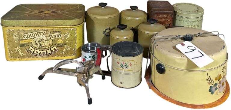 LOT 97 - LOT OF VINTAGE TIN ITEMS: CAKE SERVER, ANDROCK SIFTER, 4-PIECE CANISTER SET, TELEFLORA MEASURING CUP, CRYSTAL CANE SUGAR CONTAINER, COUNTRY STYLE BREAD BOX, FLOUR BIN; MOULI-SHREDDER MADE IN FRANCE