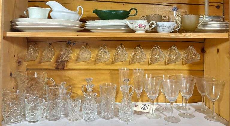 LOT 96 - ASSORTMENT OF CLEAR GLASSWARE TO INCLUDE PATTERN GLASS CUPS, CRUETS, PITCHERS, AND STEM GLASSES; SMALL ASSORTMENT OF CHINA