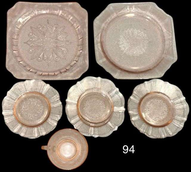 LOT 94 - LOT OF DEPRESSION GLASS: PINK ADAM DINNER PLATE, PRINCESS DINNER PLATE, 6 AMERICAN SWEETHEART DESSERT PLATES, NORMANDIE BOUQUET AND LATTICE MUG, FINE RIBBED PINK BOWL, CABBAGE ROSE PINK BOWL, MAYFAIR OPEN ROSE PINK BOWL, SMALL BLUE CRACKLE GLASS PITCHER; L.E. SMITH IRIDESCENT BICENTENNIAL PLATE