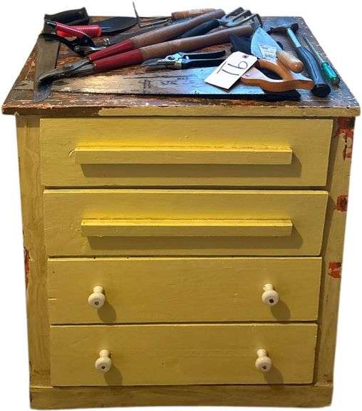 LOT 91 - VINTAGE WOODEN 4-DRAWER CABINET W/ SMALL ASSORTMENT OF HAND TOOLS: HANDSAW, HATCHET, TROWEL, SNIPS, FLATHEAD SCREWDRIVER, PAIR OF GLOVES, ETC.