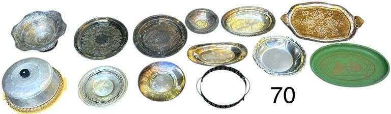 LOT 70 - 9 SILVER PLATE SERVICE PIECES TO INCLUDE FARBERWARE, S.L. & G.H. R. CO. 187, INTERNATIONAL STAINLESS, ONEIDA, AND OTHERS; 2 OTHER SERVING PLATTERS; GLASS CAKE PLATE W/ ALUMINUM LID