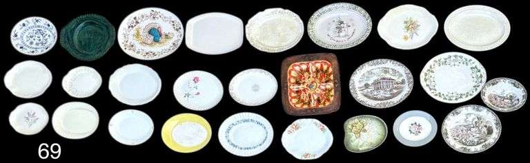 LOT 69 - APPROX. 26 SERVING PLATTERS (SOME AS-IS) TO INCLUDE JOHNSON BROS. “THE FRIENDLY VILLAGE W/ MATCHING BOWL, HOMER LAUGHLIN, STAFFORDSHIRE ENGLAND HERITAGE HALL, CHRISTMAS, HR WYLLIE CHINA, HAND-DONE TREASURE CRAFT COMPTON CA, J&G MEAKIN, PURITAN, TAYLOR SMITH USA, OTHERS MARKED USA, AND MUCH MORE